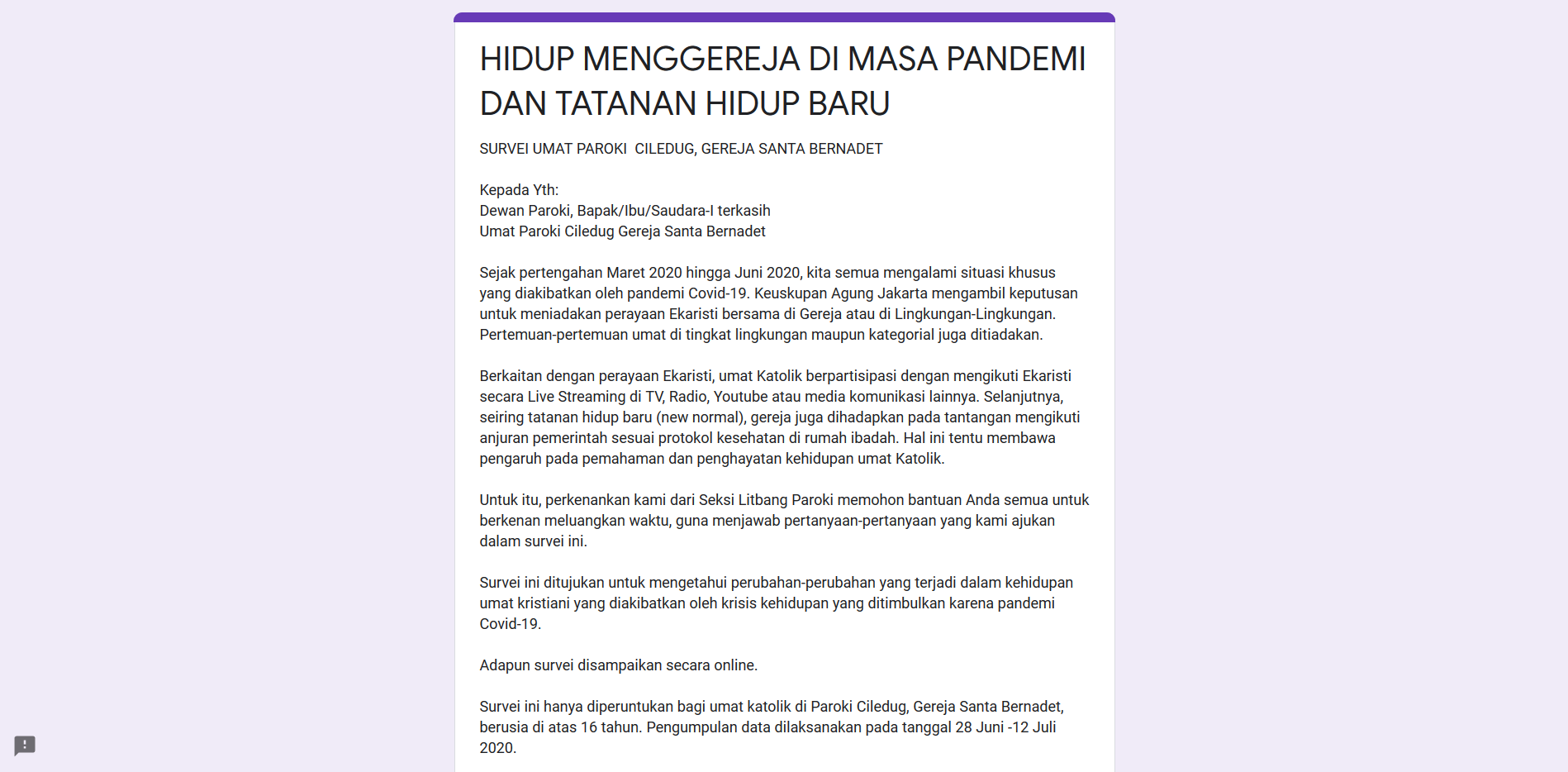 Survei Hidup Menggereja di Masa Pandemi dan Tatanan Hidup Baru