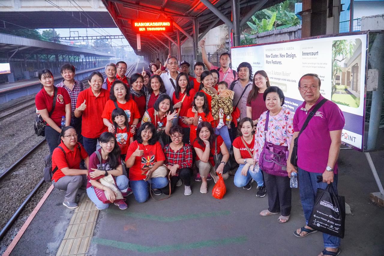 Rombongan umat Lingkungan Fabiola 3 menunggu kedatangan kereta di Stasiun Sudimara.