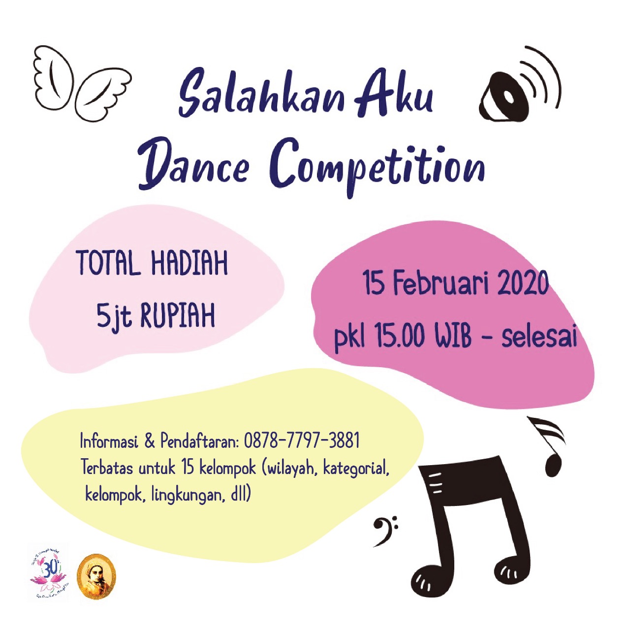 Pasti tahu khan, lagu yang sangat hit akhir-akhir ini? Siapkan saja kelompok kamu, entah kategorial, wilayah atau lingkungan dengan 8 anggota. Hanya 15 kelompok yang akan tampil. Rencananya akan di laksanakan di Sabtu, 15 Februari 2020 pukul 15.30 WIB sampai selesai. Link youtube yang bisa dipelajari, klik link ini https://www.youtube.com/watch?v=ClMSwCGhz3M Hadiahnya juga ga main-main, total senilai Rp. 5.000.000,- untuk seluruh pemenang. Silahkan kontak Edi di WA/call di 087877973881.