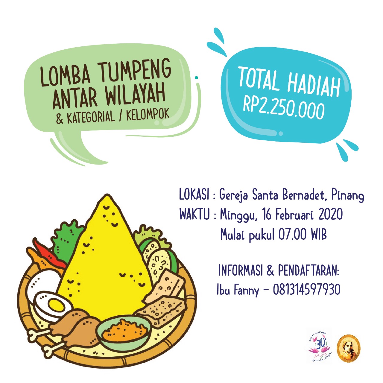 Acara yang selalu ditunggu setiap tahun, Lomba Tumpeng. Ya, lomba tumpeng ini ternyata bisa menyatukan seluruh umat dari berbagai wilayah dan lingkungan. Ingat tanggal mainnya, Minggu 16 Februari 2020 pukul 07.00 WIB – selesai